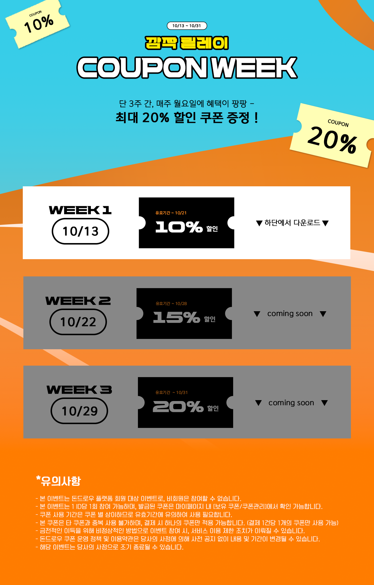 [게릴라혜택] 깜짝 릴레이 COUPON WEEK! ㅣ 최대 20% 할인쿠폰 증정 ㅣ 3주 간, 매주 월요일에 혜택이 팡팡-