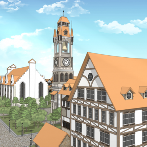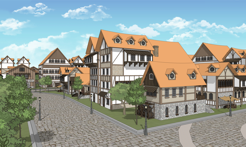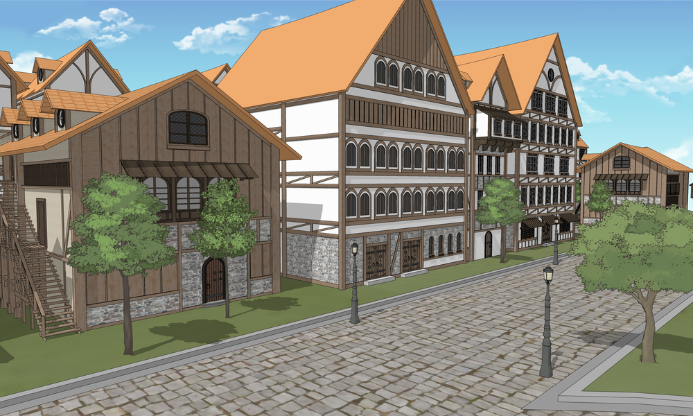 밝은 컬러의 건물들이 특징인 중세 배경에 어울리는 판타지 마을입니다.