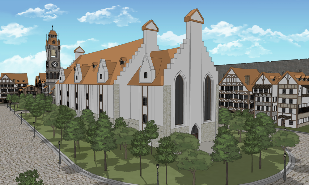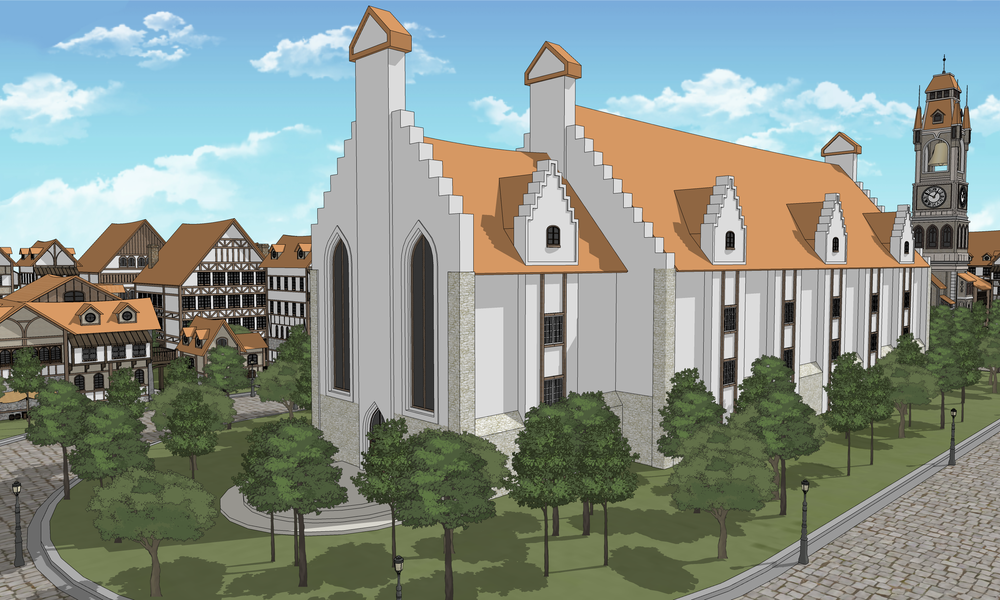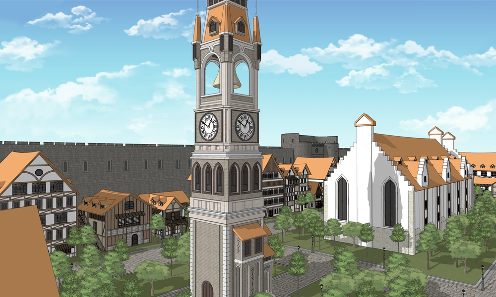 중앙에 위치한 높은 종탑과 주변을 에워싼 골목,건물들을 디테일하게 표현하였습니다.