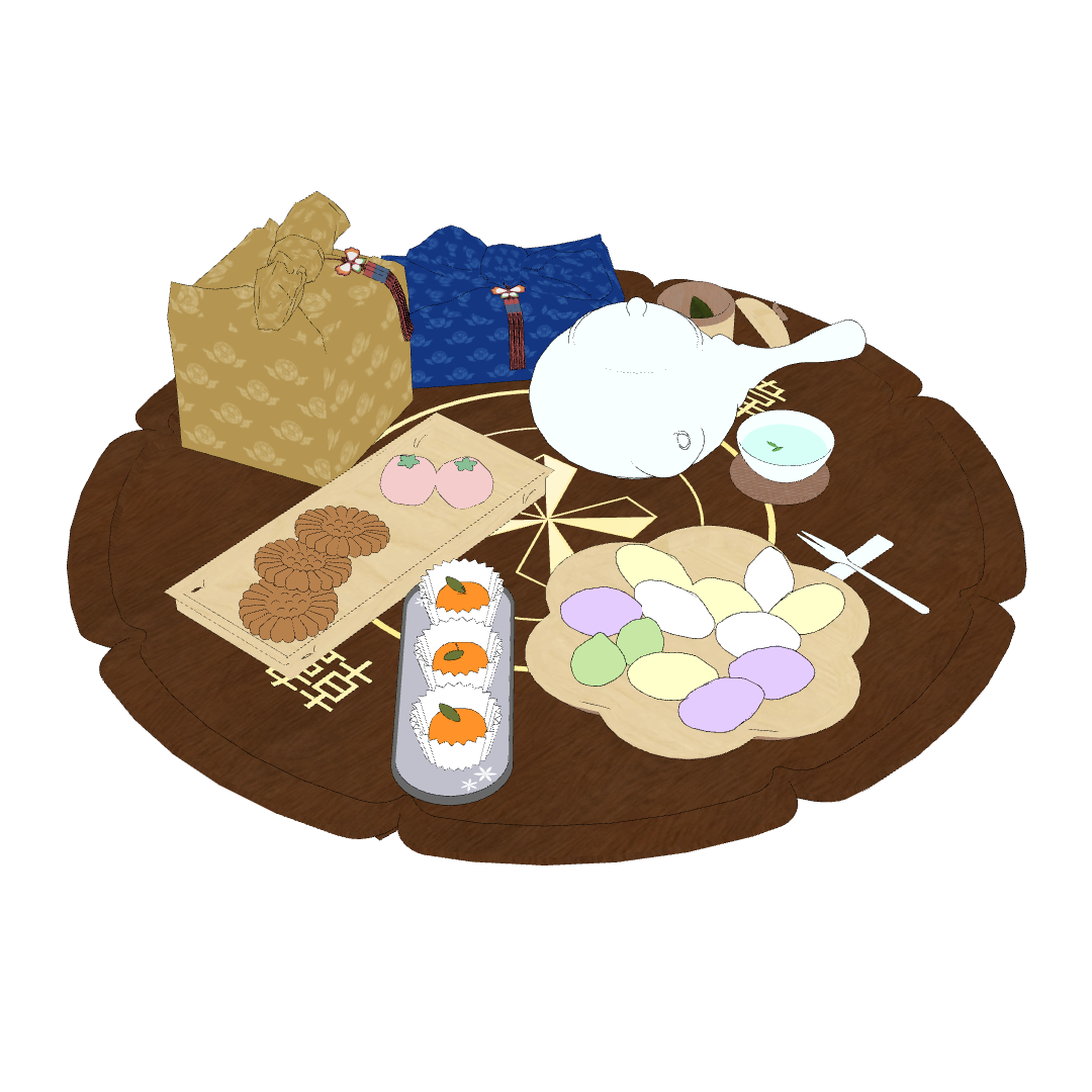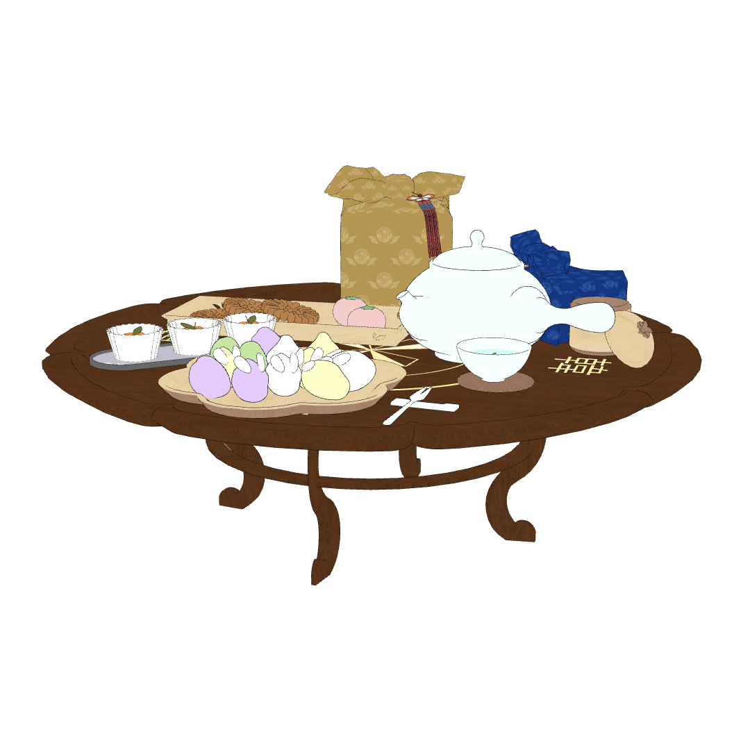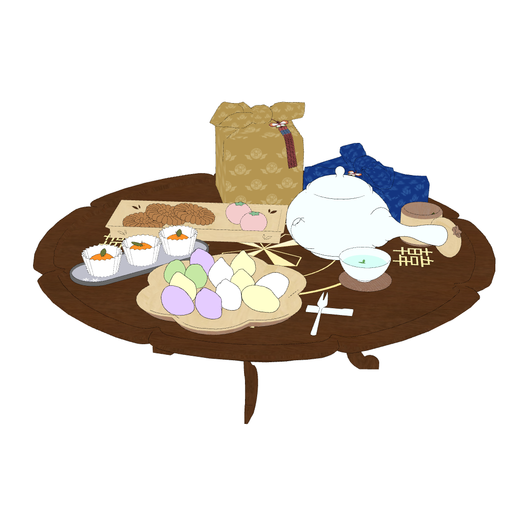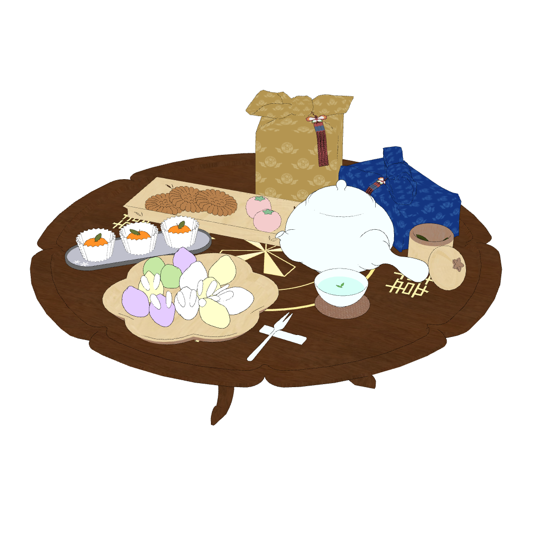 다과상 위에는 토끼 송편과 약과 등 다양한 한과들이 가득 올려져 있습니다!