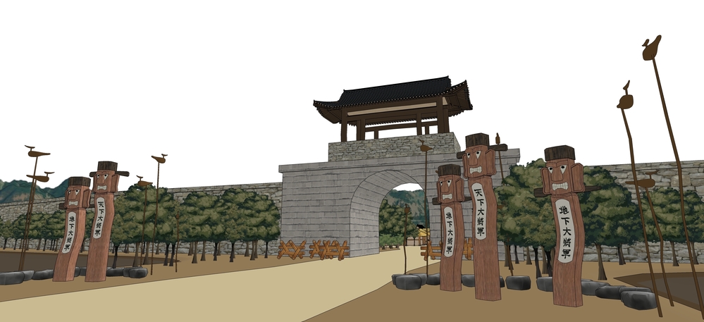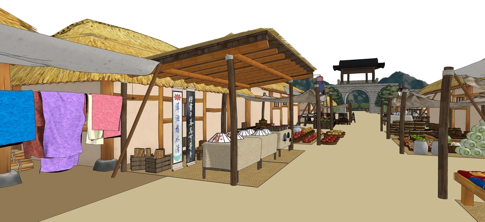 초가집, 기와집, 채소류, 소쿠리, 과일류, 장승, 천막 등 입니다.