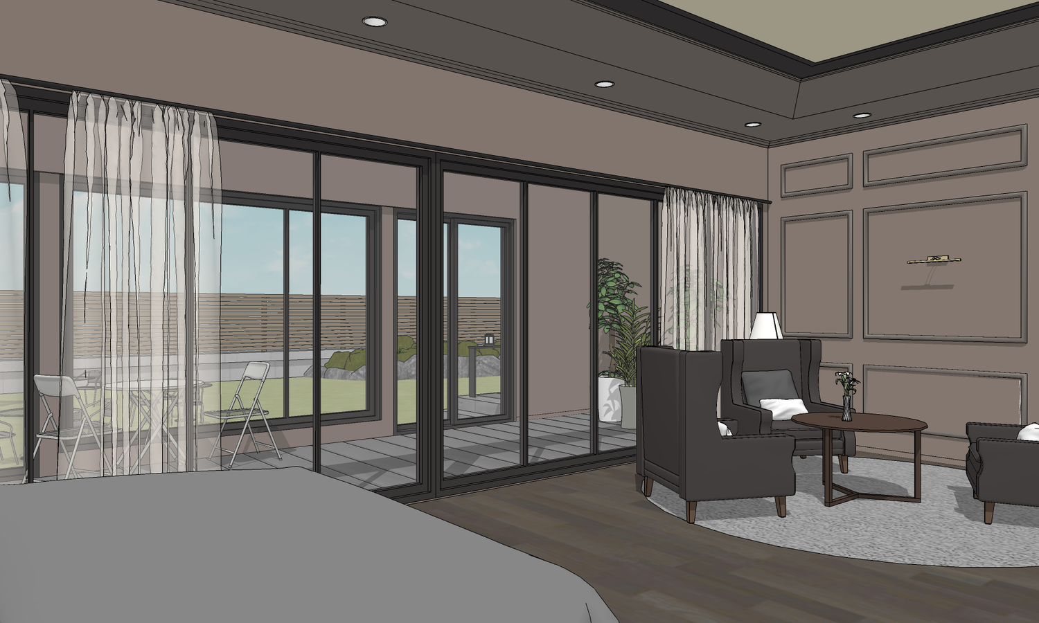 고급스러운 인테리어부터 해서 넓은 앞마당과 큰 주택 외부로 구성되어있는 침실 내부입니다.