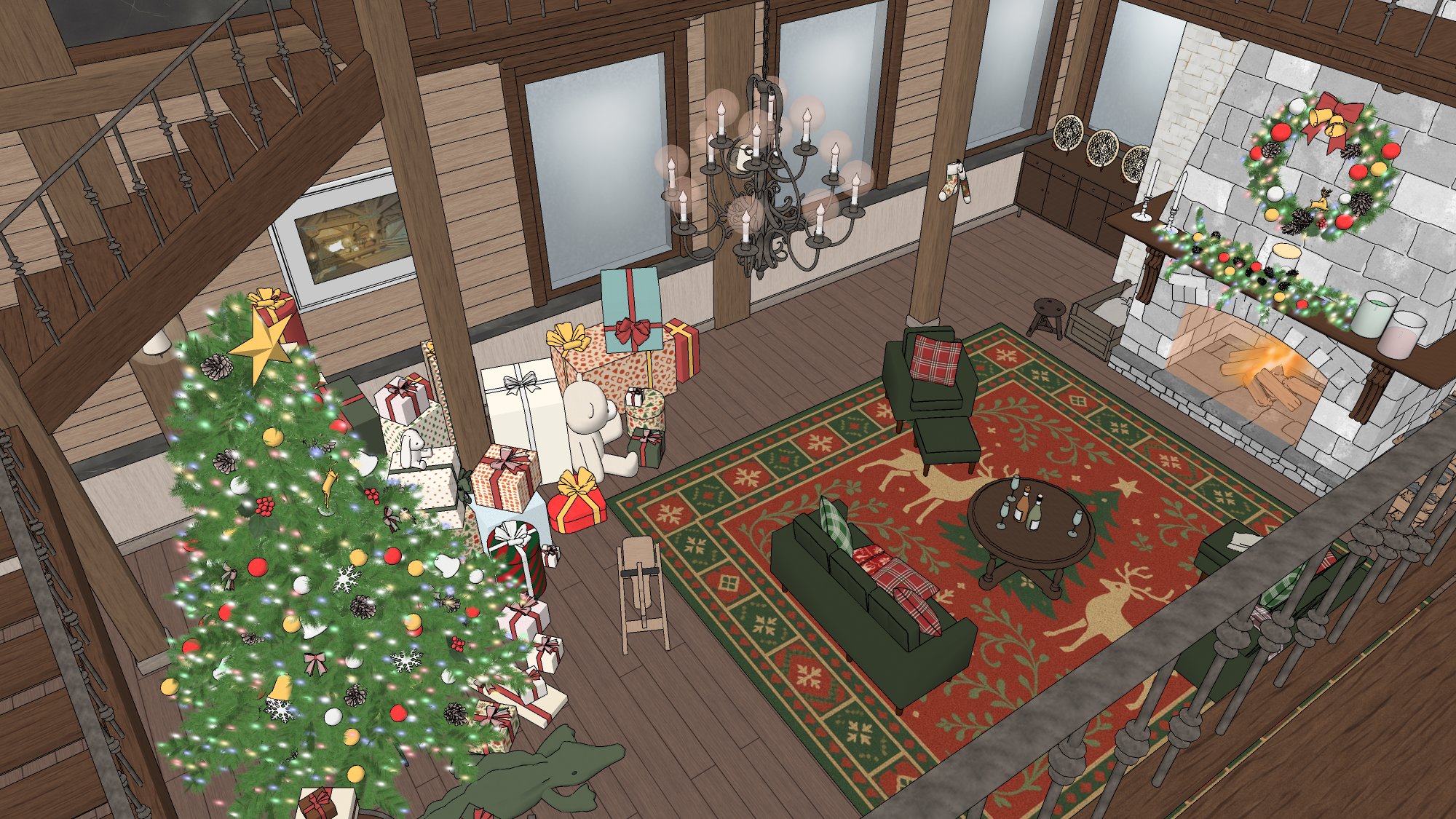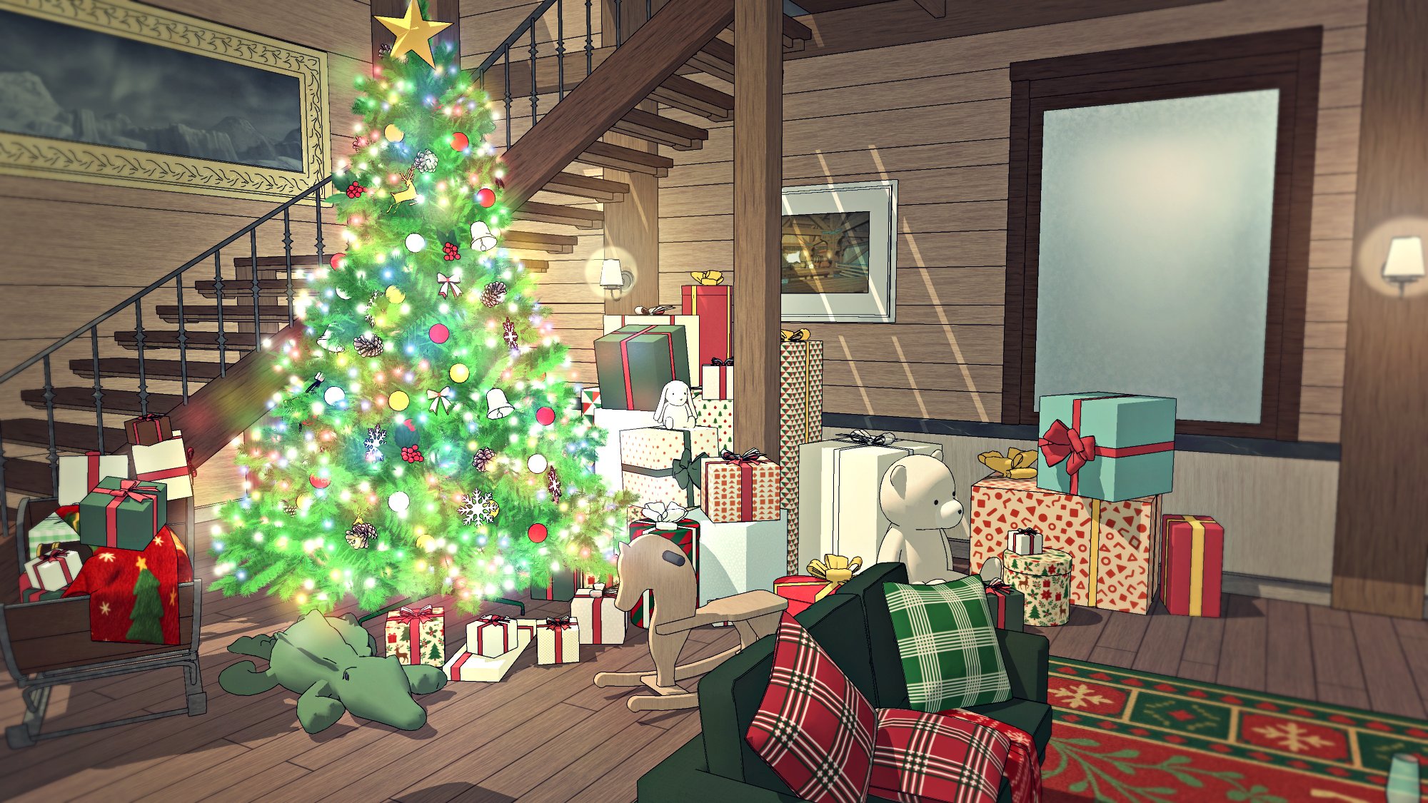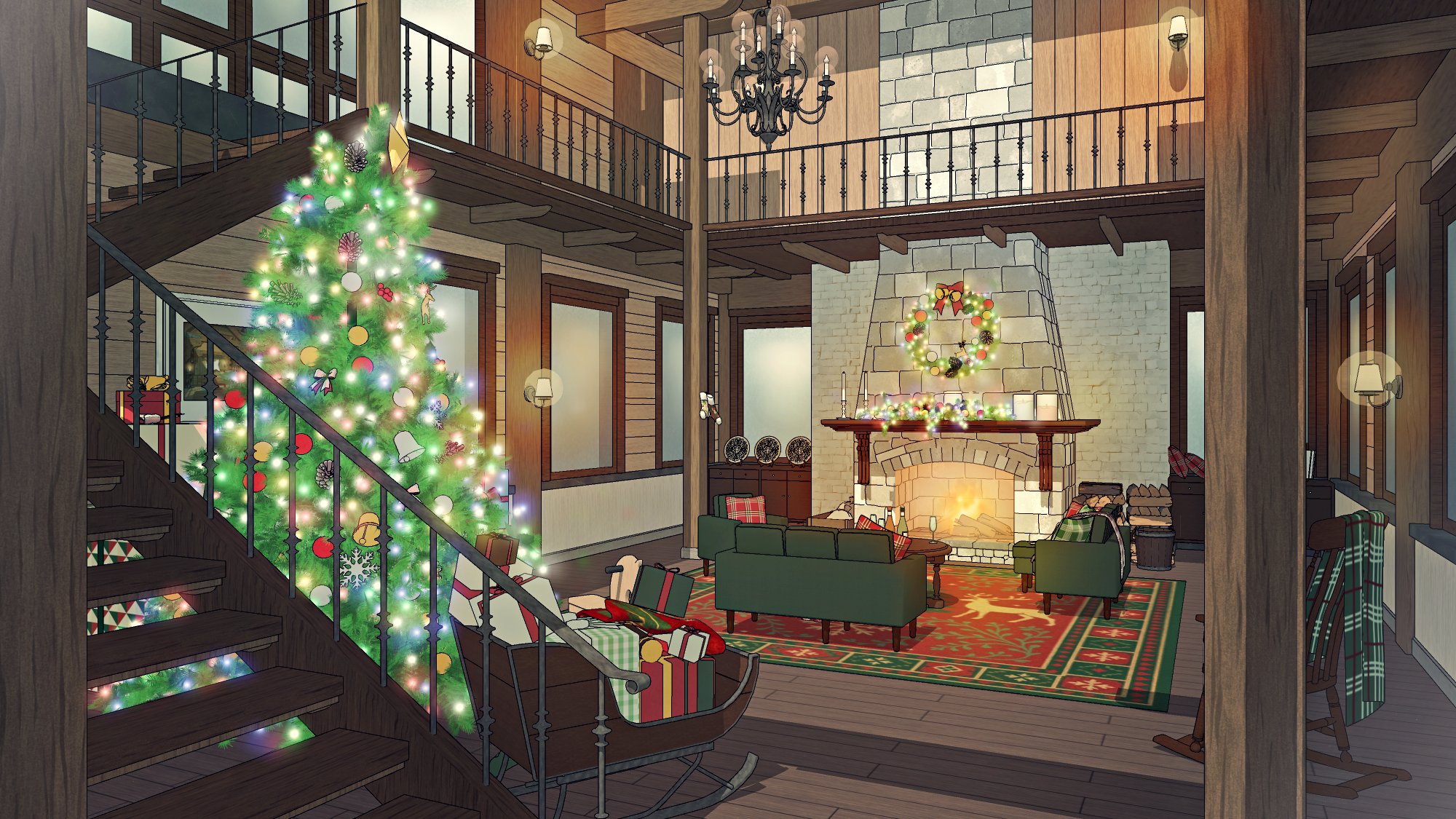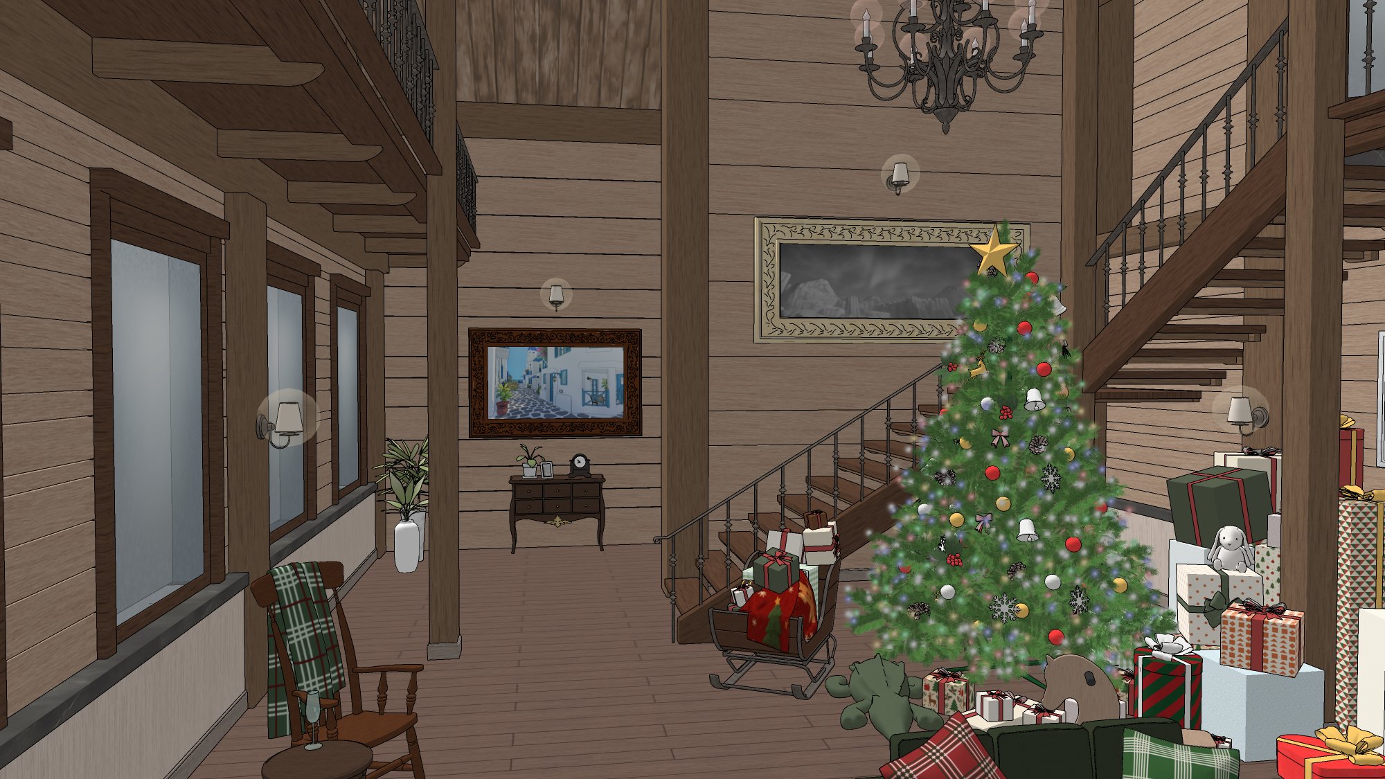 #현대 #현대물 #현대배경 #현대물배경 #크리스마스 #연말 #파티 #선물상자 #인형 #크리스마스트리 #벽난로 #X-MAS #귀여운 #따뜻한 #코지 #cozy #아늑한 #별장 #트리 #담요 #쿠션 #발코니