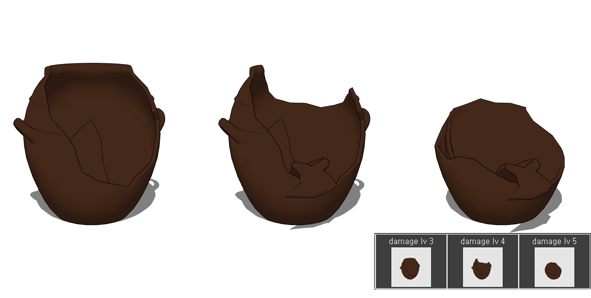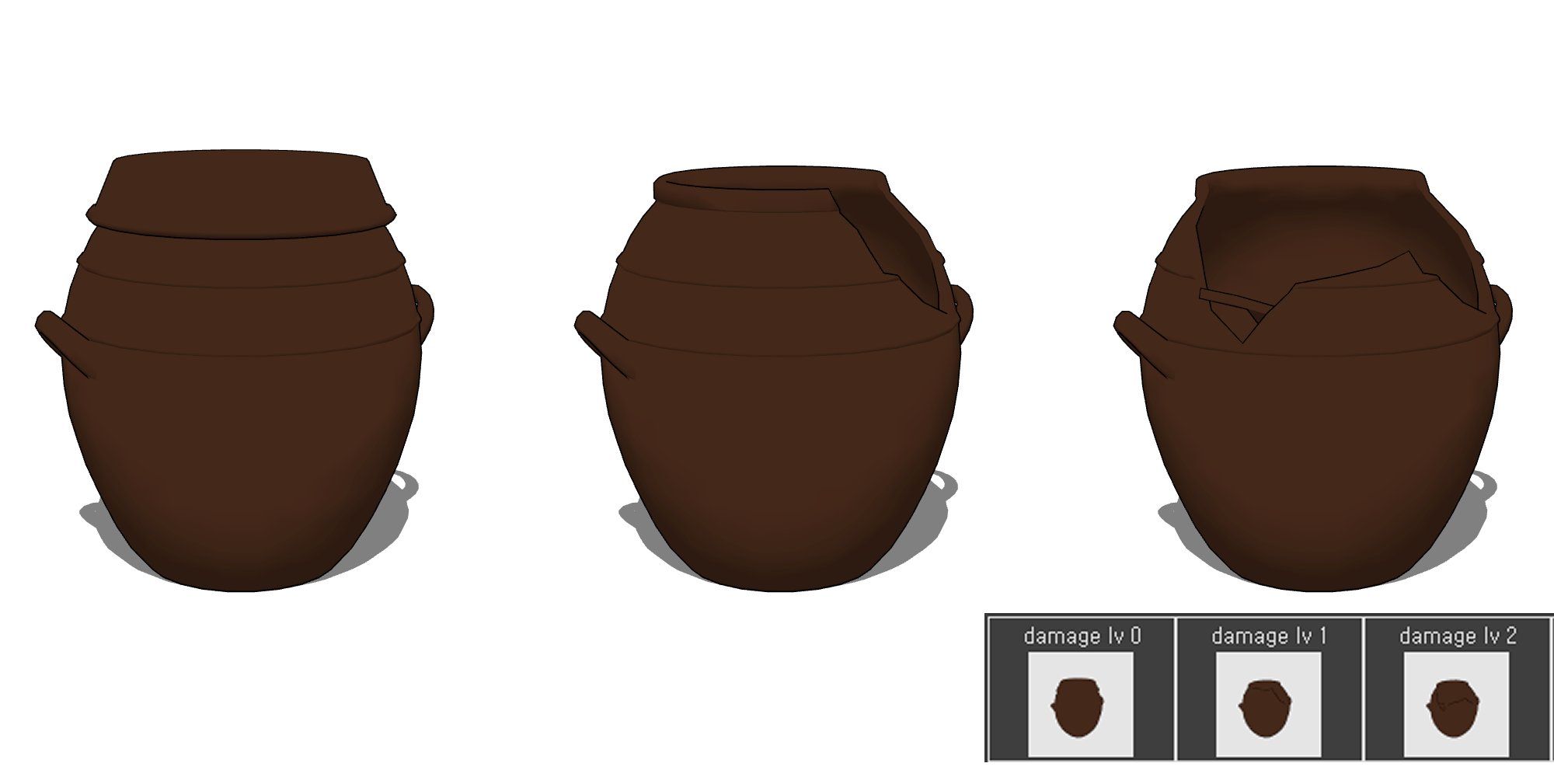 동적구성요소를 통해 깨진 모습을 5단계로 구현 할 수 있어 어떤 불운한 사고나 사건의 장치로 활용 가능합니다.