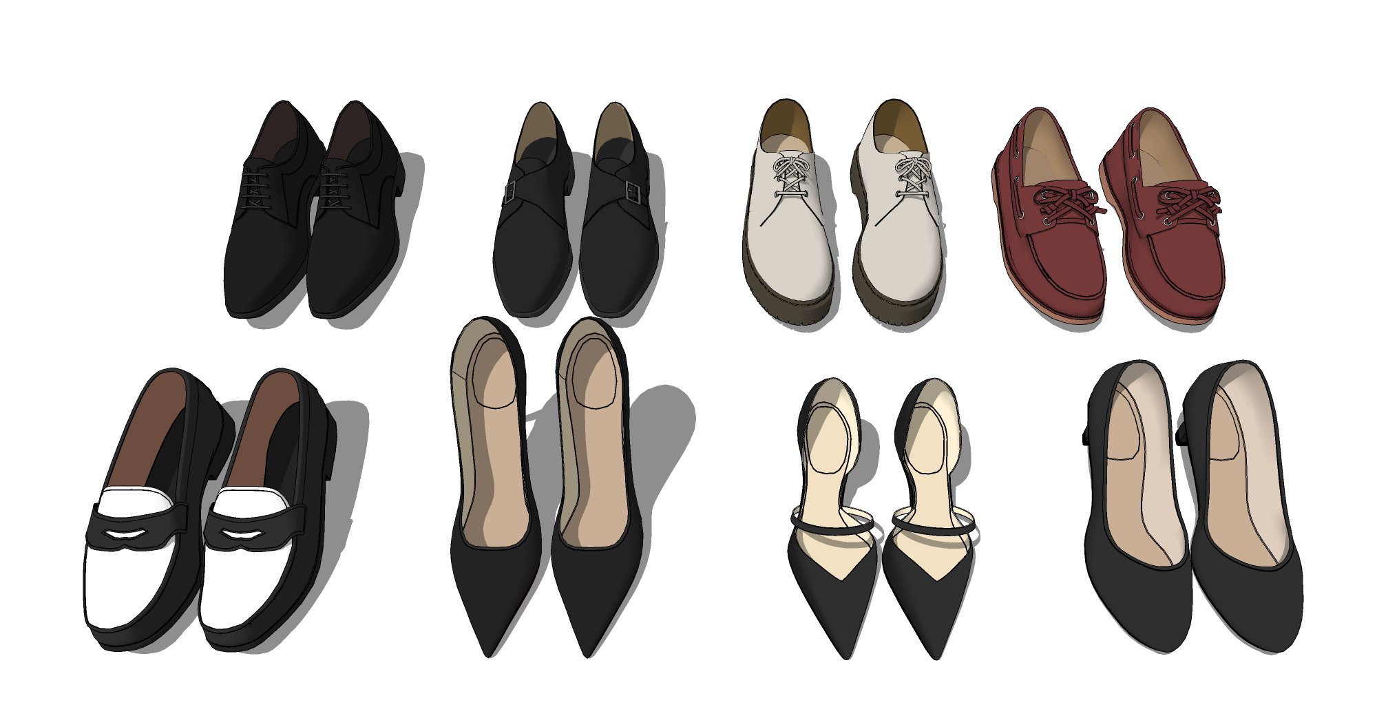 앞코와 목의 리깅까지 적용된 3D 현대 신발 구두 세트로 자연스런 연출을 해보세요.