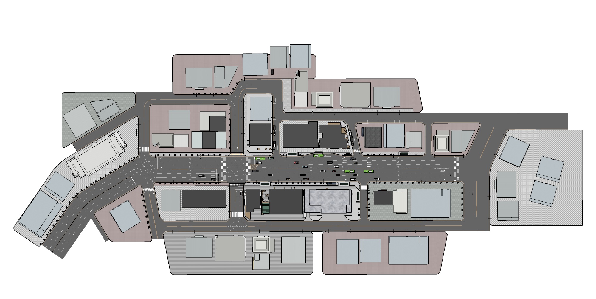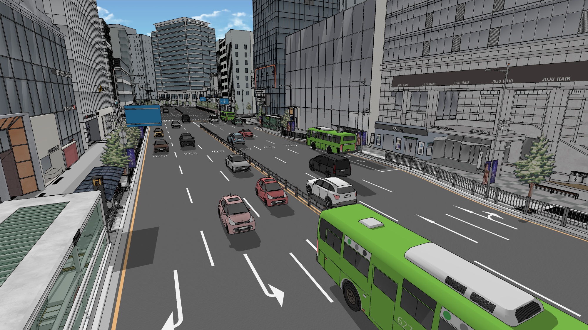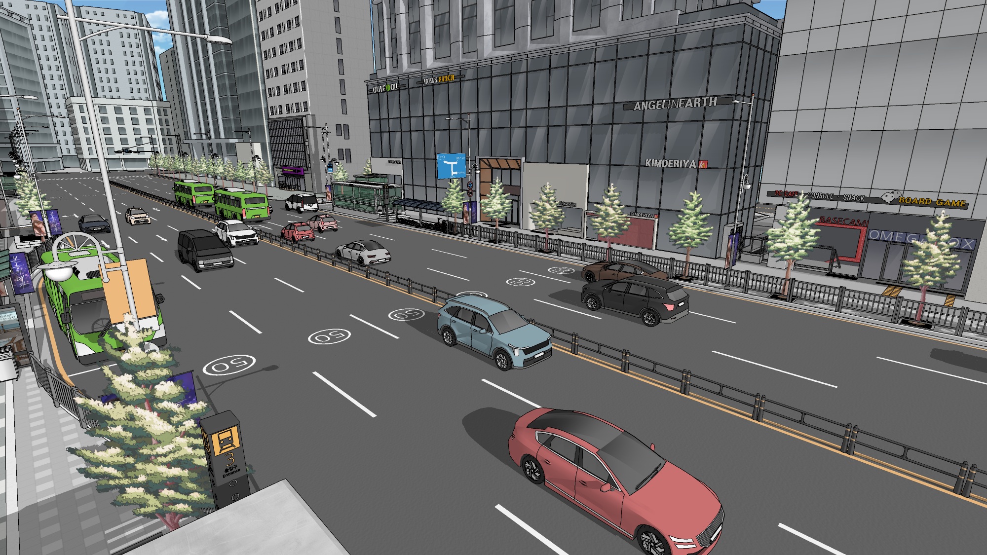 또한 지하철역과 버스정류장이 포함된 6차선 대로를 구성하여