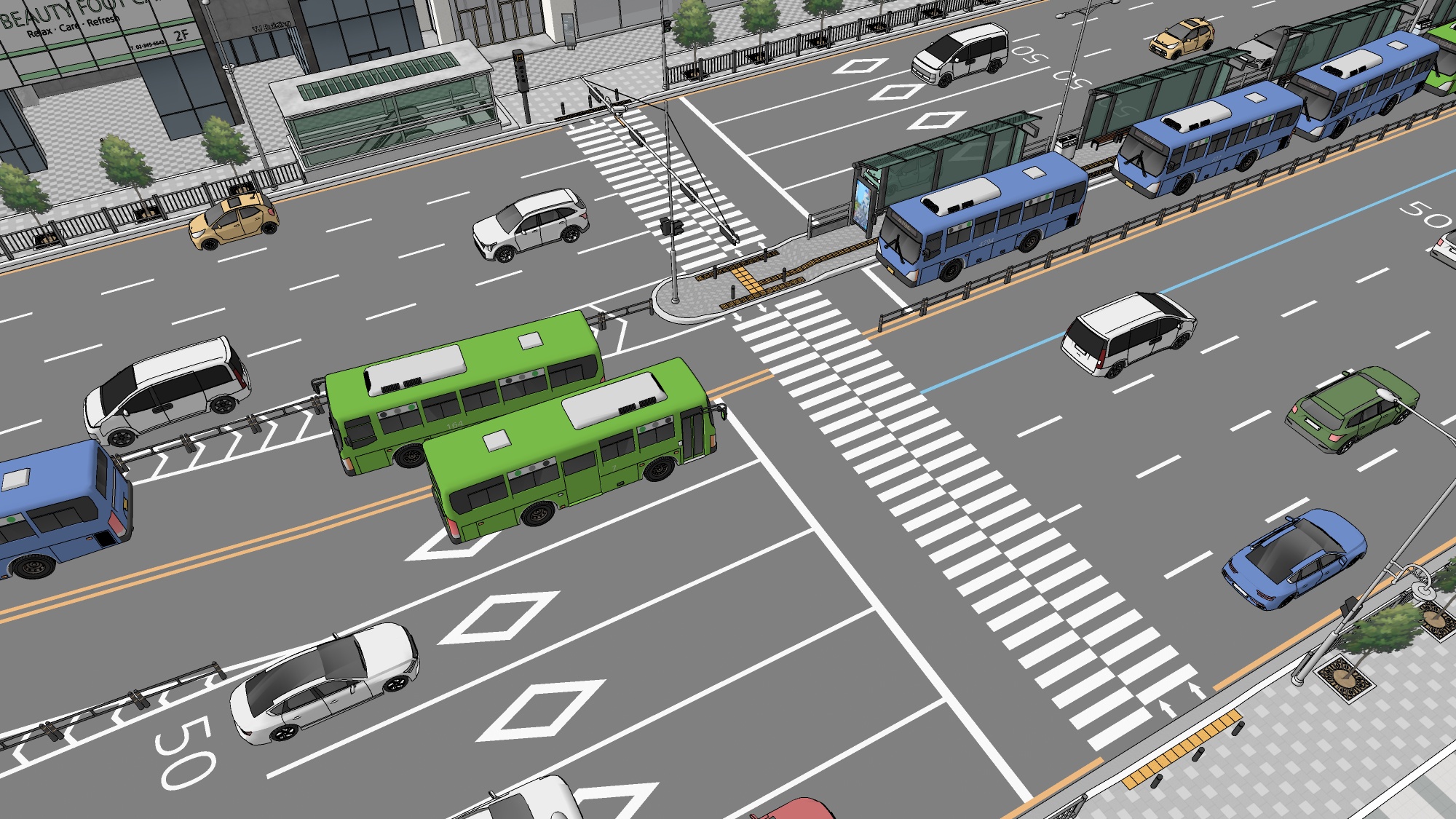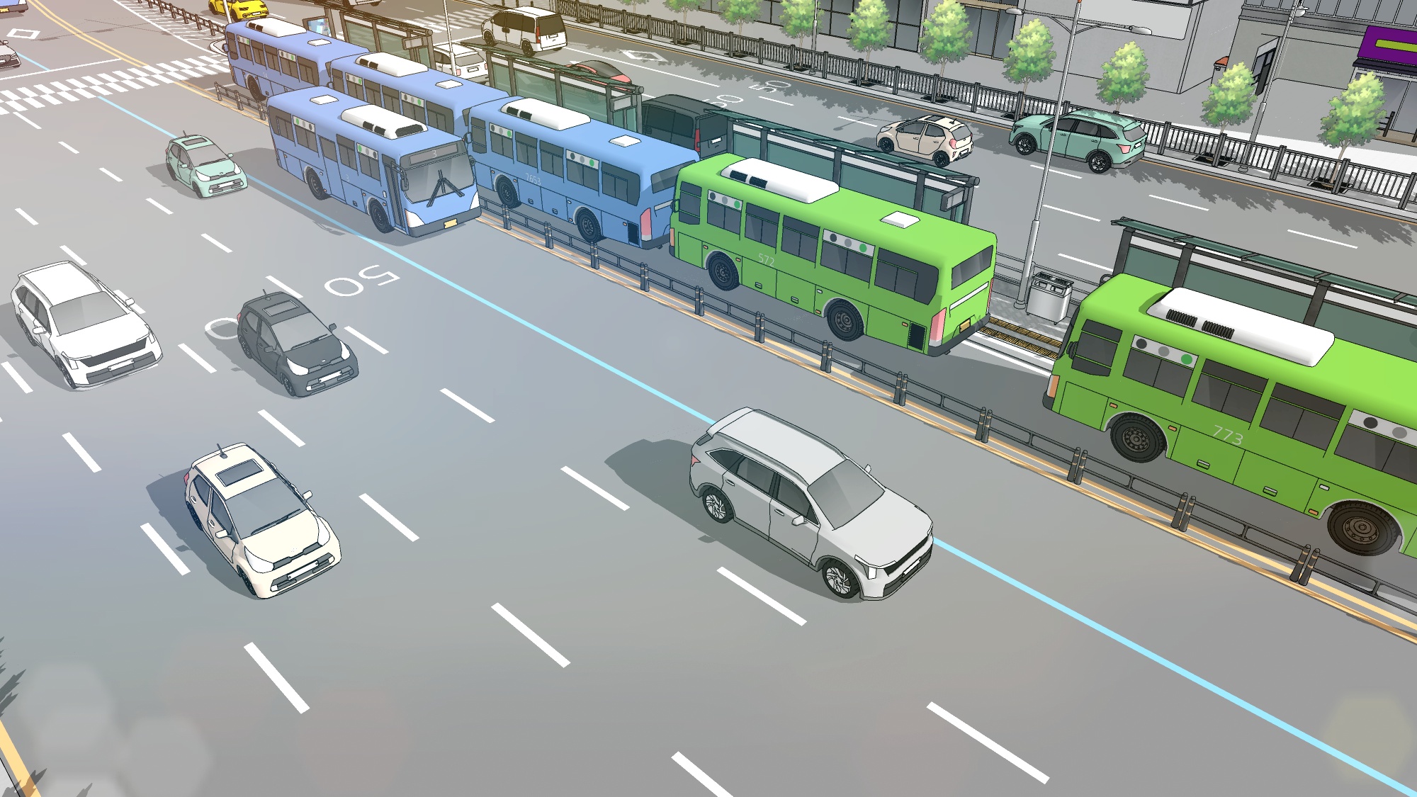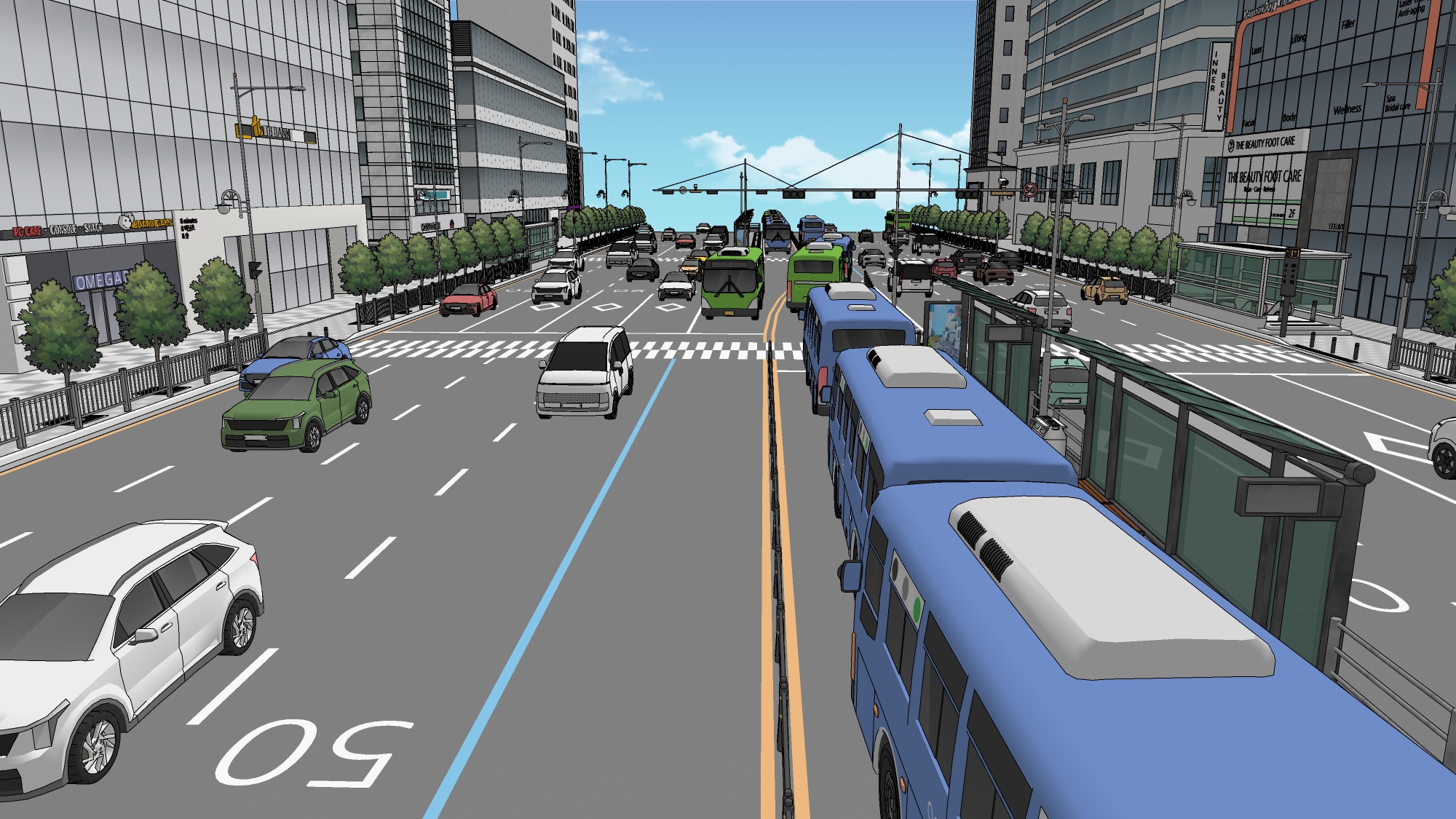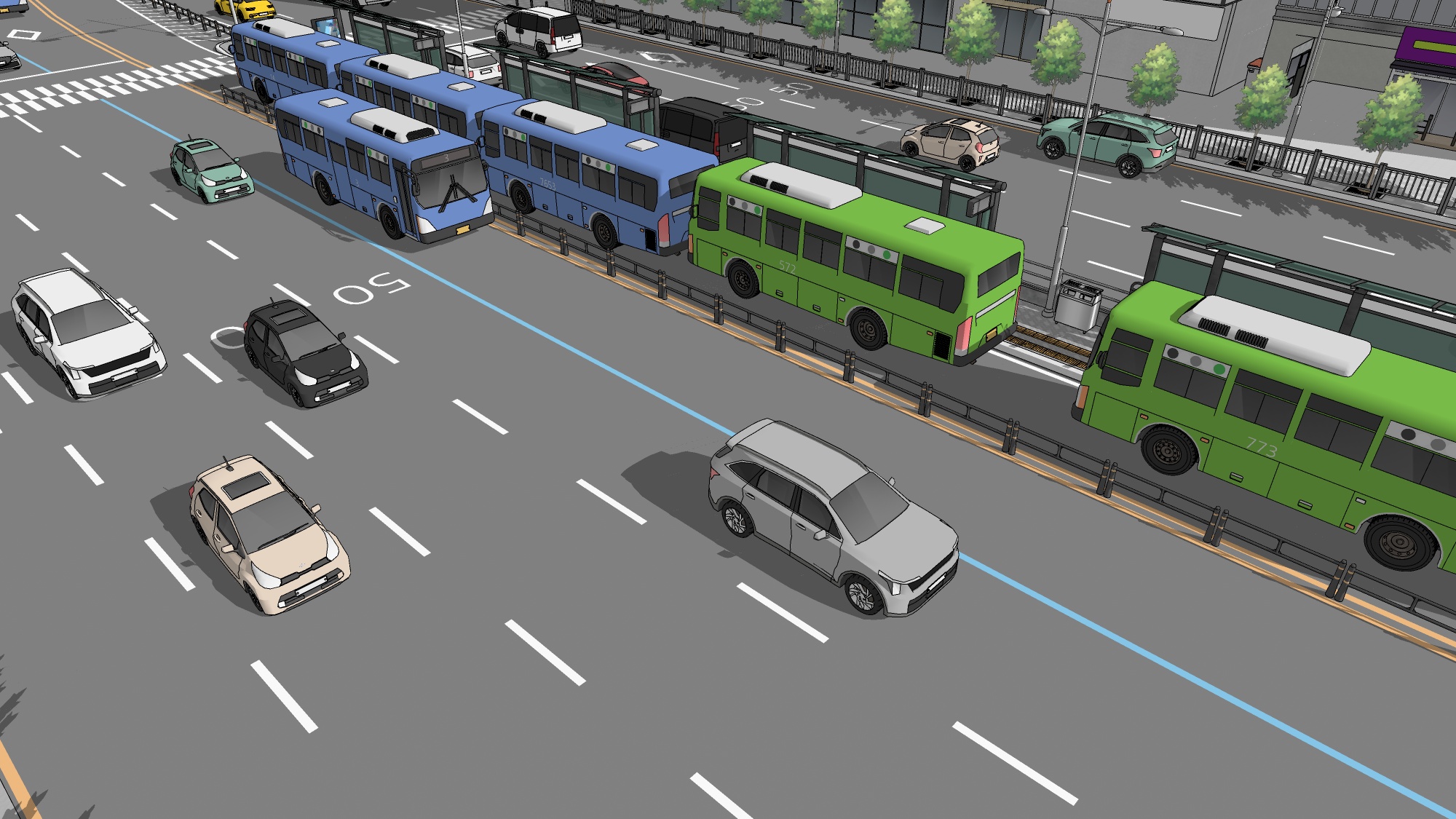 중앙차로 및 버스정류장과 함께 배경용 차량이 포함되어 있어
