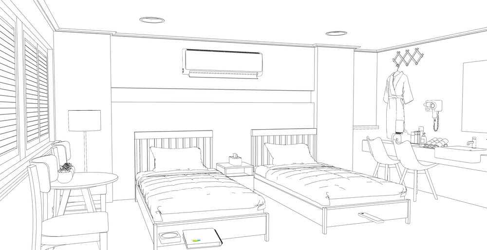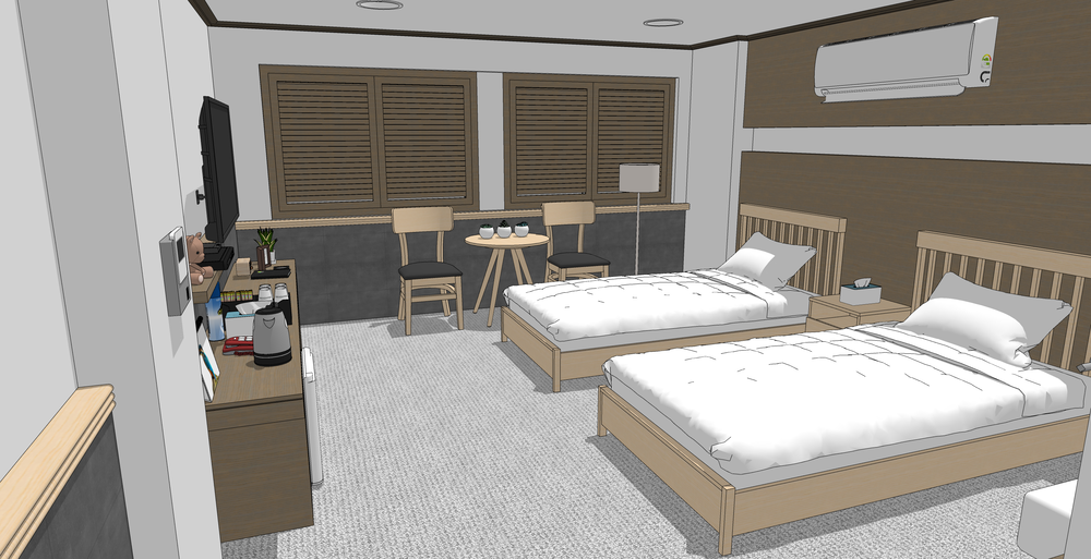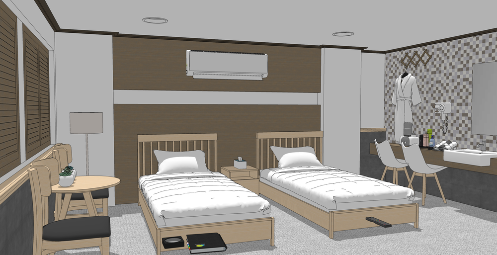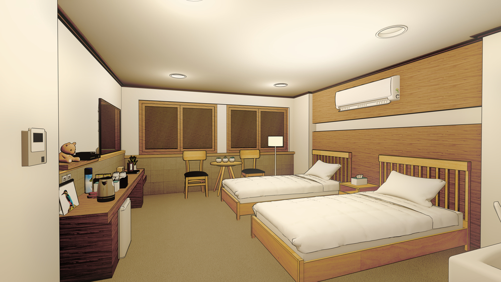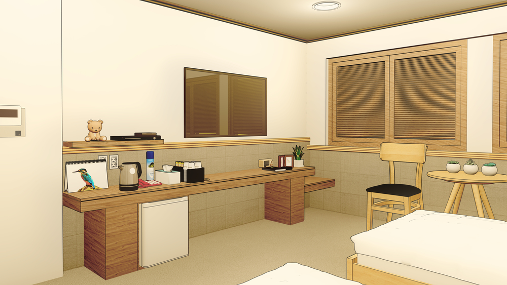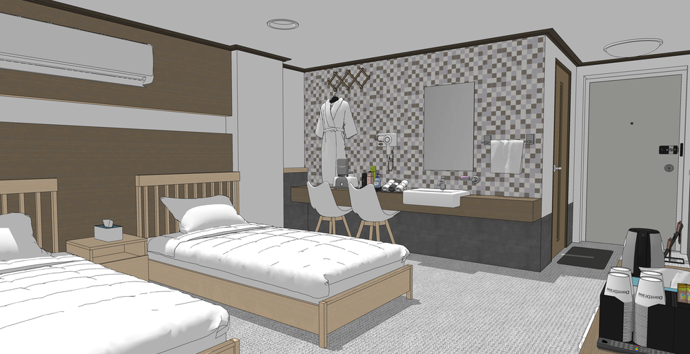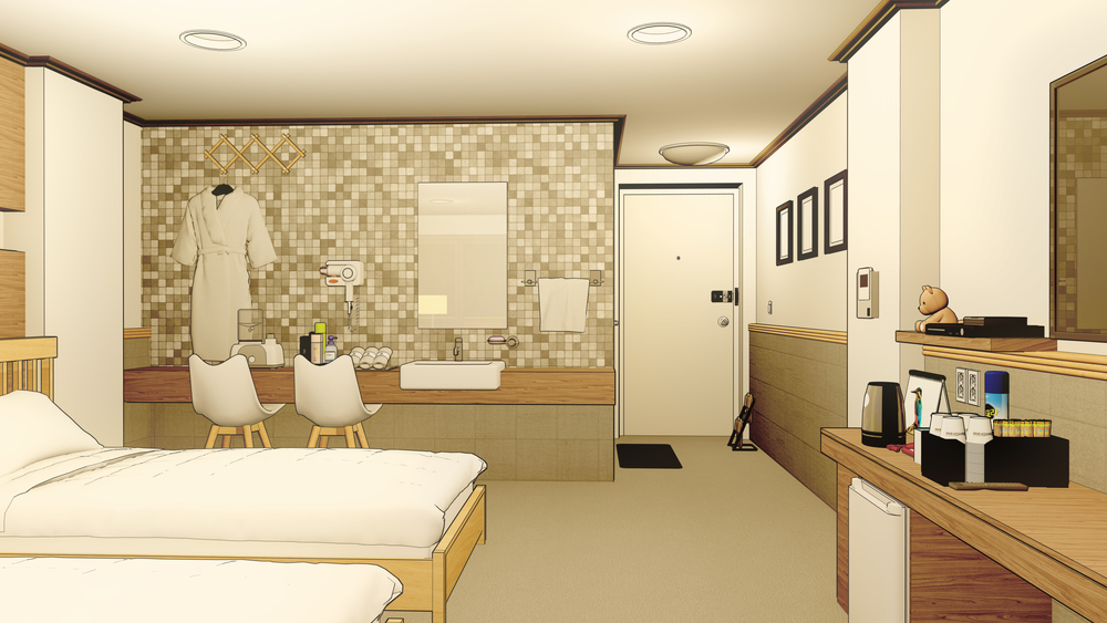 전체적으로 우드 톤의 모텔 배경입니다.