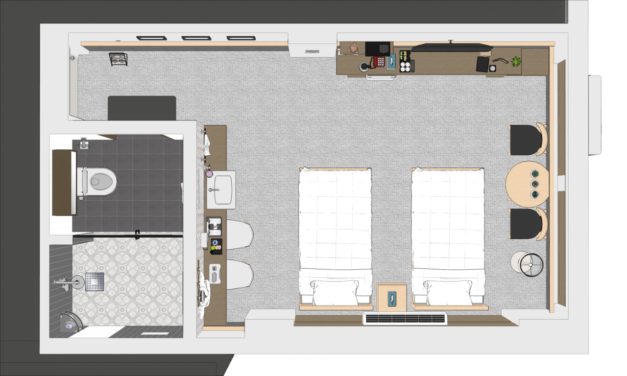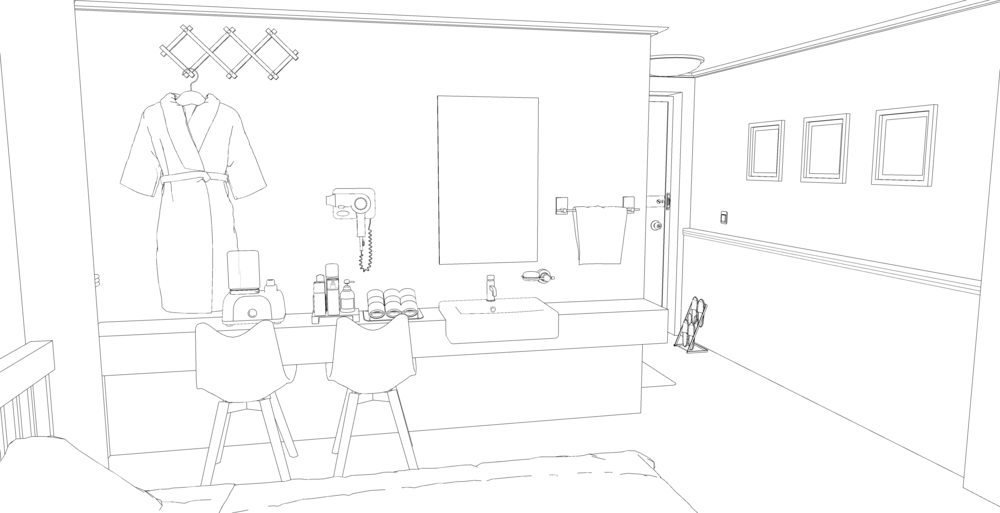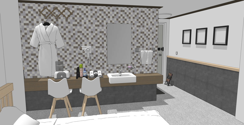드라이기, 가운, 전기포트 등 여러 소품들을 공간 분위기에 맞게 배치했습니다.