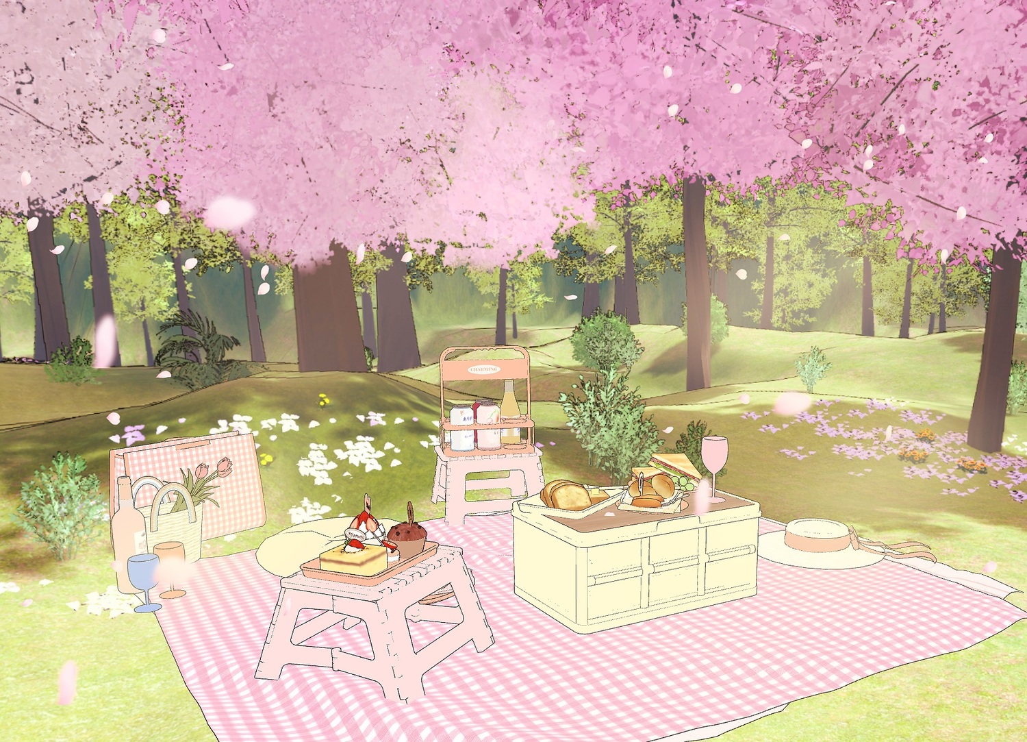 분홍빛으로 만개한 벚꽃나무 밑에서 다양한 디저트와 음료를 즐기며
