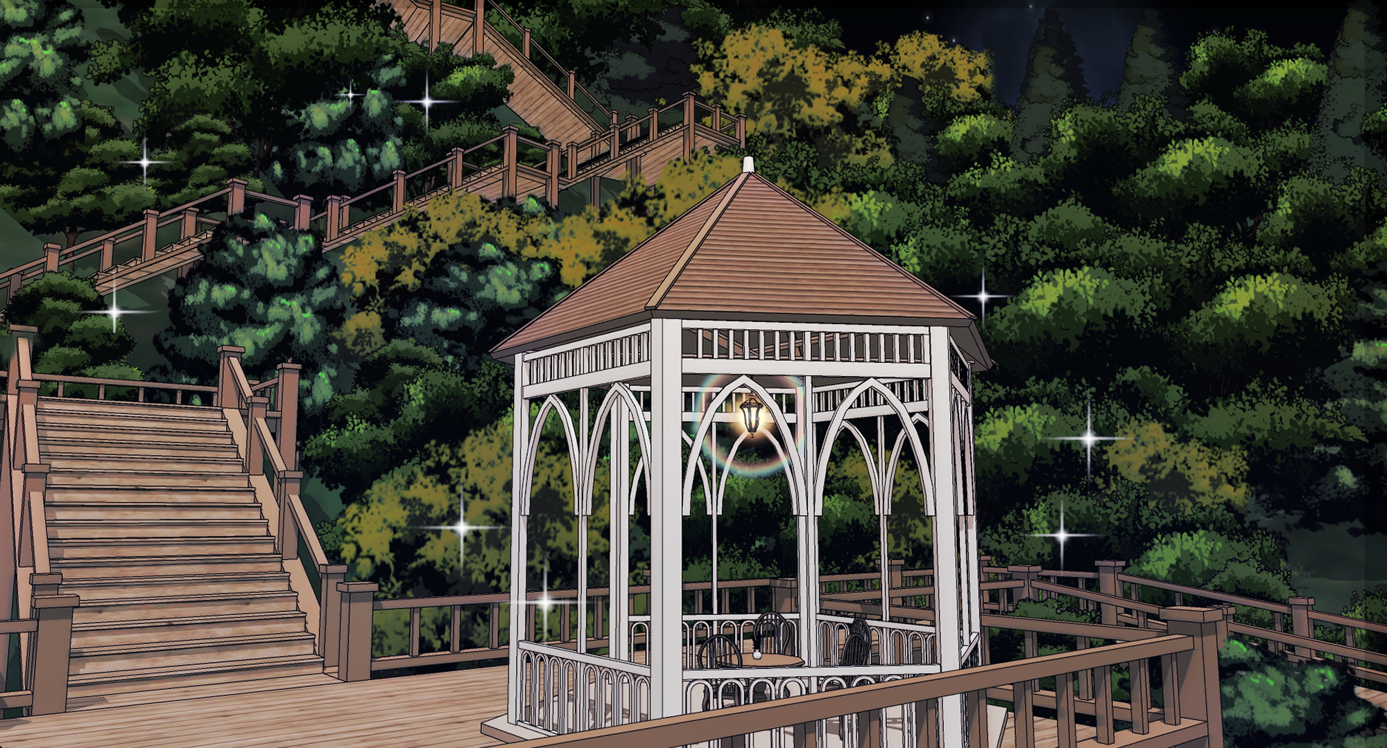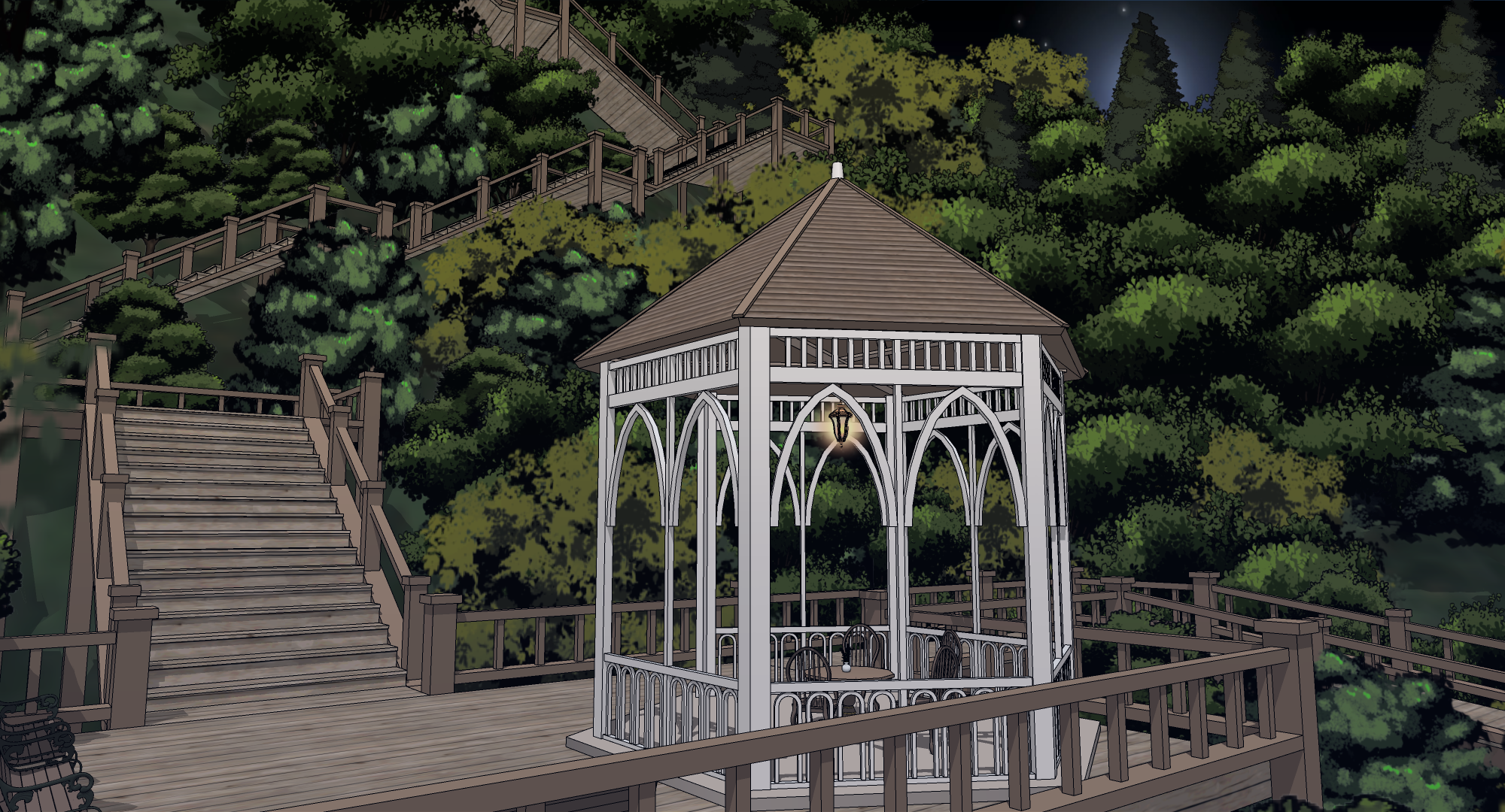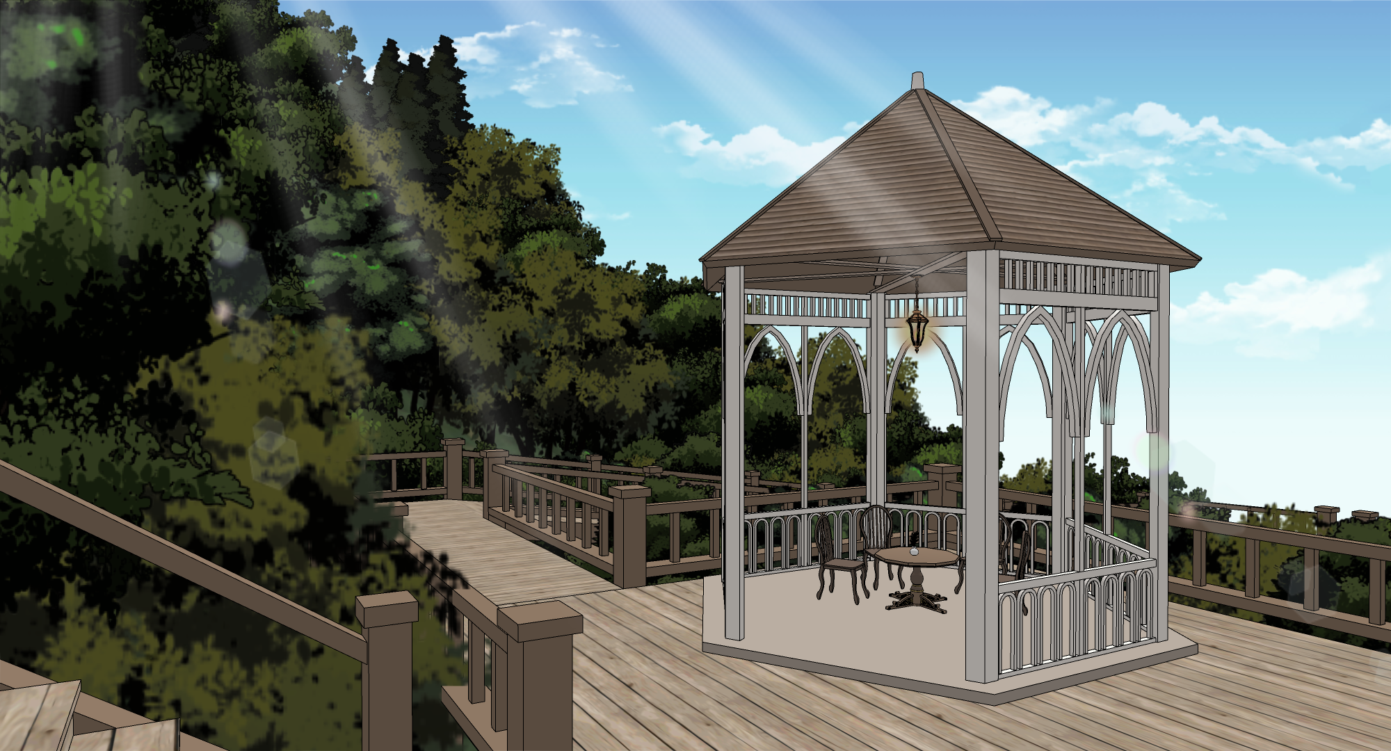 산을 배경으로 한 휴식처로, 티타임을 가지는 모습이나